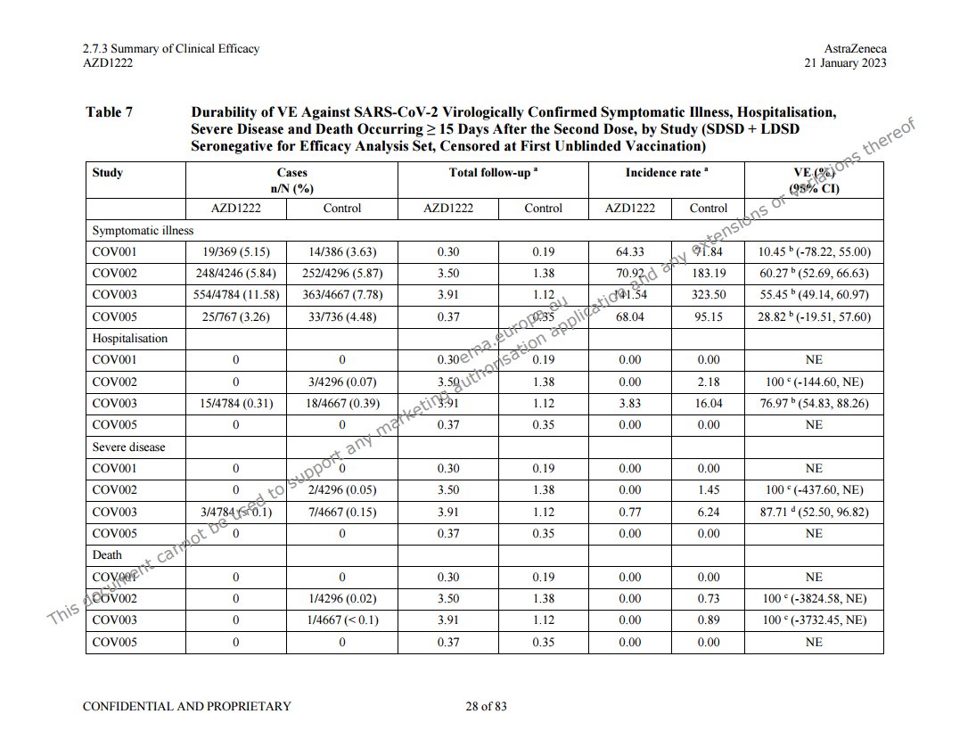 these two tables are right after each other in the efficacy summary file, p28. https://mega.nz/folder/OJwTgazL#pYVUqu2y3jUkWLFttRD9bQ/file/bZgwSZyQ "first unblinded vaccination" means vaccination in or out of the study, so it's a later timepoint than "unblinded", non-AZ covid jabs weren't excluded. pretty bad either way!