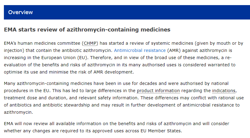 https://www.ema.europa.eu/en/documents/position/azithromycin-article-31-referral-notification_en.pdf it seems to boil down to "it worked pretty fucking well because it's the first choice and there's no actual evidence of resistance except more bugs in general and more azithro prescribed so we need to review dosing and safety" its outrageous tbh