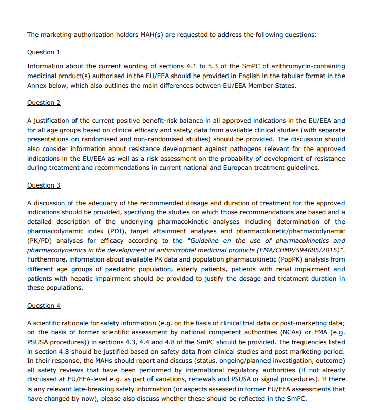 https://www.ema.europa.eu/en/documents/referral/azithromycin-article-31-referral-chmp-list-questions_en.pdf there's a set of eight questions asked of the MAH, no idea who that is for a generic ab? wonder if any of the regs referred to here have been updated lately?