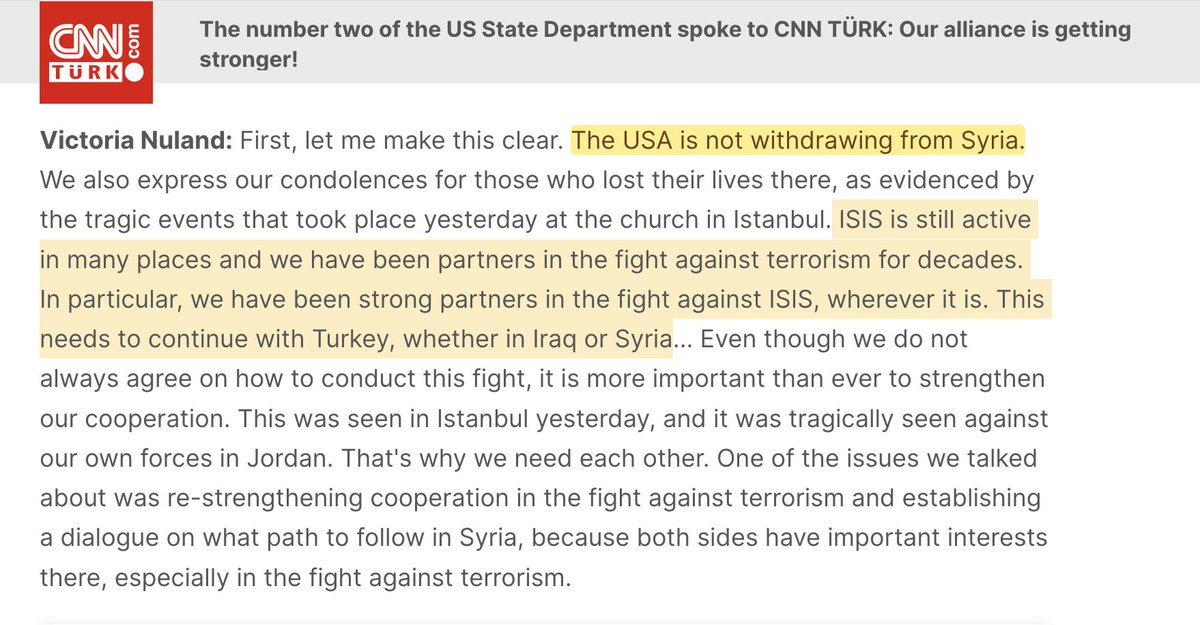 After the killings of 3 US troops, top State Dept. official Victoria Nuland declares that "the USA is not withdrawing from Syria." She adds that the US needs to stay to fight ISIS. Pentagon documents show that this is a lie: the US is barely fighting ISIS. In fact, the US has let ISIS grow when it can threaten the Syrian government. Which speaks to the real reason for the US occupation of Syria: as admitted quietly by a senior Biden official and other DC neocons, the US is there to steal Syria's oil and wheat in order to punish its people for successfully resisting the CIA-led regime change war. (https://www.aaronmate.net/p/to-keep-troops-in-syria-us-leaders)