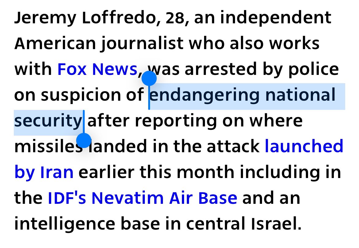 According to Israel’s @ynetnews, Israel is charging US journalist Jeremy Loffredo with “aiding the enemy during wartime and providing information to the enemy” for reporting on the Israeli military targets hit by Iran earlier this month. Israel is detaining and prosecuting an American journalist for doing journalism. Will his media colleagues defend him? https://www.ynetnews.com/article/ryjxg00b1je