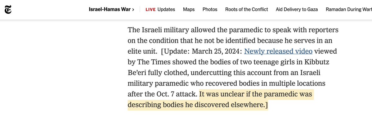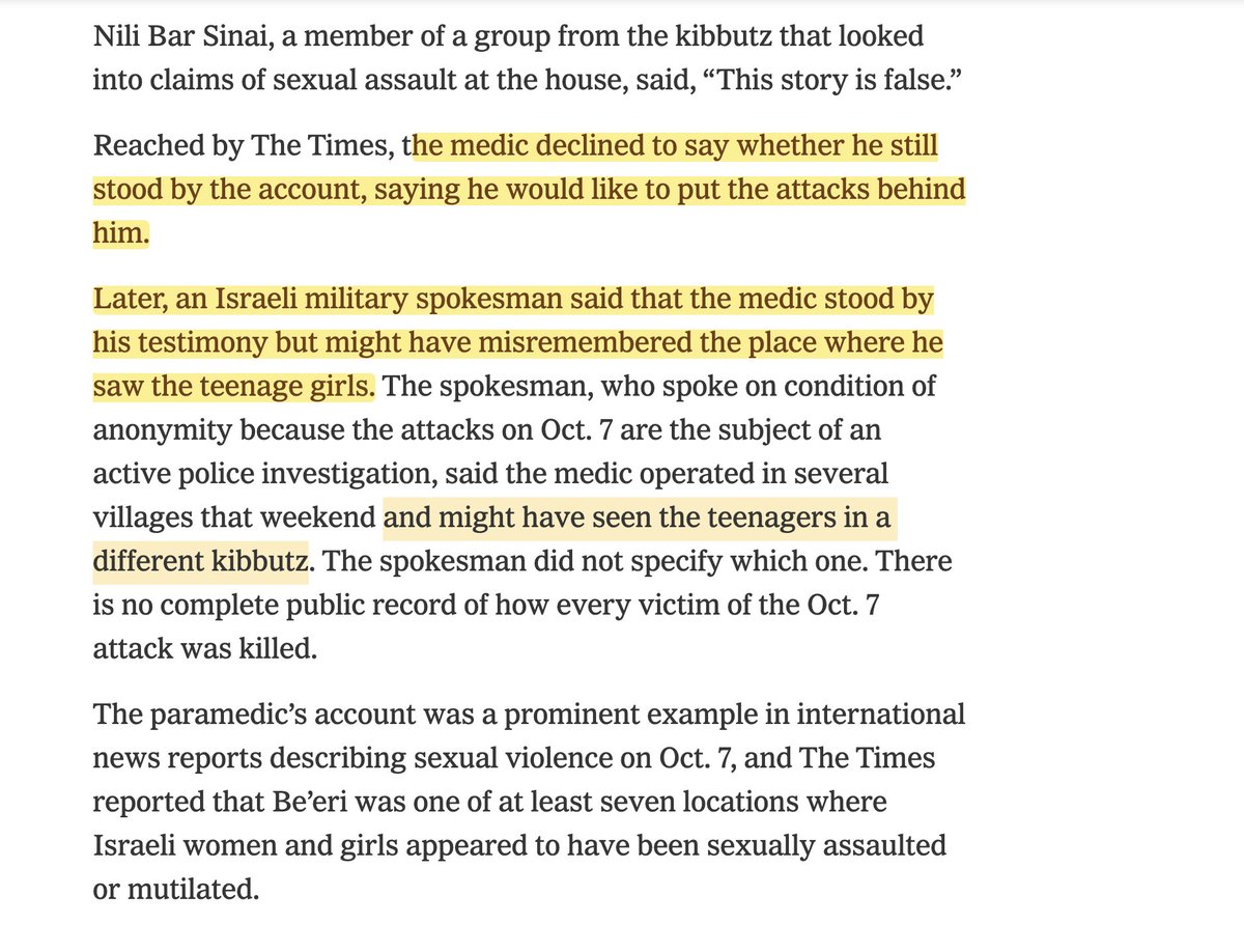 New humiliation for NYT's @gettleman, lead author of the "Hamas sexual violence" scam. The *NYT itself* has now confirmed that one of Gettleman's key "witnesses" -- a medic from an Israeli paramilitary unit -- falsely claimed to have seen evidence that two females suffered sexual violence at Kibbutz Be’eri on Oct. 7th. Video from an Israeli soldier proves it. (https://nytimes.com/2024/03/25/world/middleeast/video-sexual-assault-israel-kibbutz-hamas.html?unlocked_article_code=1.fU0.ltUw.z4pNLV4fFPEd&smid=url-share…) @TheGrayzoneNews called out this medic's falsehoods months ago. (https://thegrayzone.com/2024/01/10/questions-nyt-hamas-rape-report/) How can the NYT continue to stand by a story that it's now being forced to debunk?