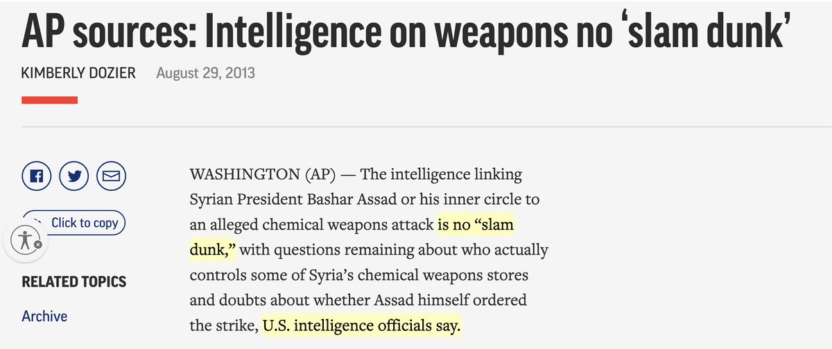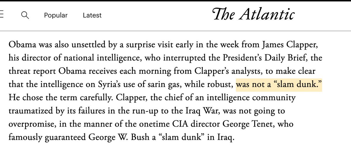Obama officials leaked that the intel about Assad wasn't a "slam dunk." This was a deliberate reference to the Iraq WMD hoax. Obama later confirmed that directly. (https://apnews.com/article/c2ad647bc3c248f286ad4d186f1ba9d2) (https://www.theatlantic.com/magazine/archive/2016/04/the-obama-doctrine/471525/)
