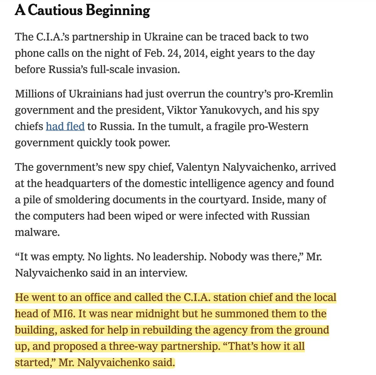 According to a new account in the NYT: On the night of the Maidan coup in Ukraine ten years ago, Feb. 24th 2014, Ukraine's post-coup spy chief Valentyn Nalyvaichenko arrived at his new headquarters and made his first call to "the C.I.A. station chief and the local head of MI6." He asked them "for help in rebuilding the agency from the ground up, and proposed a three-way partnership." Why was Ukraine's new spy chief already on such good terms with the CIA and MI6, literally on the night of a coup that brought his new government to power? 🤔