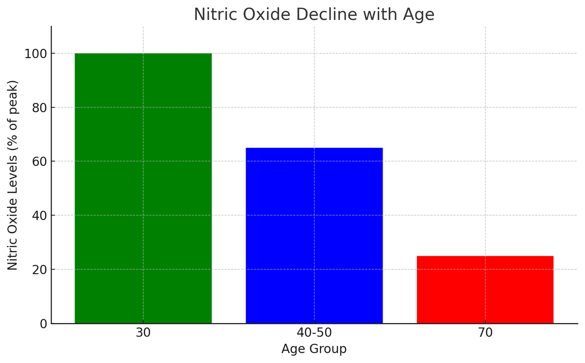 By 30, nitric oxide starts to decline. By 40–50, levels have dropped by 20–50%. By 70, you’ve lost 75% of it. The result?