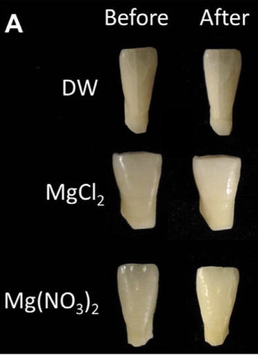 Magnesium Chloride flushing an in-vitro experiment from January 2016 showed that a applying a solution high in MgCl2 (magnesium chloride) improved micro-hardness of Enamel by 9.6% it does this by shrinking the size of all the nanocrystals found in the teeth, the smaller these crystals are, the denser the Enamel gets (you can see the effect it had on the shade of the teeth in the picture down below) But this makes a great argument for using sea water (which is high in MgCl2) or a self made Magnesium Chloride/water solution to swish through your mouth multiple times a day making your own MgCl2 solution is easy as fuck by the way: https://t.co/0cIudGLbb7