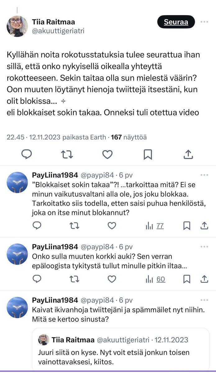 @akuuttigeriatri @MStromming @tkaasalainen @helenapesonen1 @MiinaNuikkinen @pasiz @MarjaTerhi @Annina06578550 Tarkistin sinusta laittamani twiitit sinun blokkauksesi ajalta. Kaikki, yhtä lukuunottamatta, olivat muiden ketjuissa ja suurin osa ”keskustelusta” alteregosi kanssa (ehkä sekoitti laskelmasi). Twittejä oli alle 10. Joten älä liioittele.
