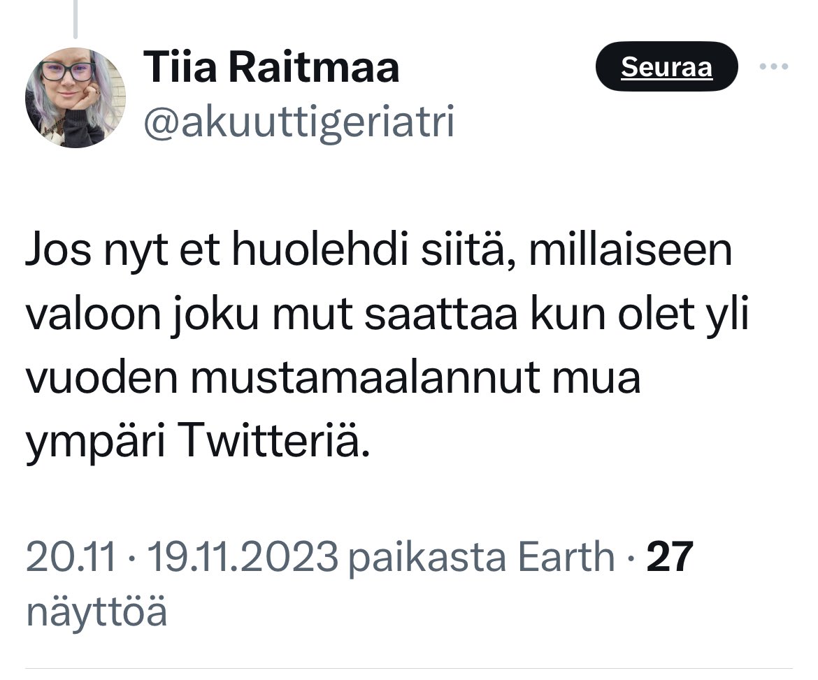 @MarjaTerhi @paypi84 @MStromming @tkaasalainen @helenapesonen1 @MiinaNuikkinen @pasiz @Annina06578550 Terhi, on varmaan parempi, ettet näe mun twiittejä kun sun selkeästi tulee niistä paha olo vaikka ne eivät edes viittaa sinuun millään tavalla. Kaikkea hyvää, toivottavasti sulle löytyy hoito ja saat apua.