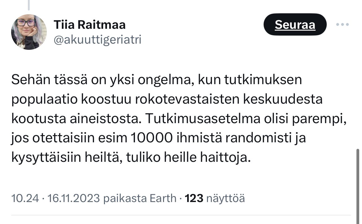 @akuuttigeriatri @Suviquu1 @olssi @paypi84 @MarjaTerhi Tämähän menee mielenkiintoiseksi. Minkä aihepiirin keskusteluihin viittaat, ja kuka "tutkimuspuolen ammattilainen" on osoittanut minun olleen väärässä. https://t.co/AyWd5g0Tc5