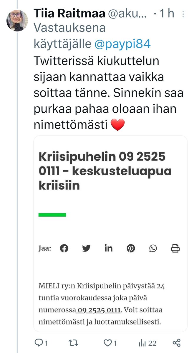 Olen esittänyt @AleksiReito saman kysymyksen kuin @MikaelNiku , eli kuka heidän viestinnästään on vastuussa. En ole puhunut vastuuseen joutumisesta mitään. Reitohan väitti löytyvän tutkimusnäyttöä, joka sulkee mRNA-tuotteiden roolin ylikuolleisuudessa pois. Kun niitä hänen linkkaamiaan tutkimuksia käytiin tarkemmin läpi, niin eiväthän ne tukeneet hänen väitettään. Kyse ei todellakaan ollut mistään piinaamisesta, vaan ihan normaalista faktantarkistuksesta. Disinfoa on liikkeellä jo muutenkin tarpeeksi, ei sitä tarvitsisi enää kenenkään lääkärin levitellä, varsinkaan jos esiintyy @TampereUni ja @Tays_sairaala biossaan. Ja on lisäksi @SuomenAkatemia :n rahoittama tutkija.