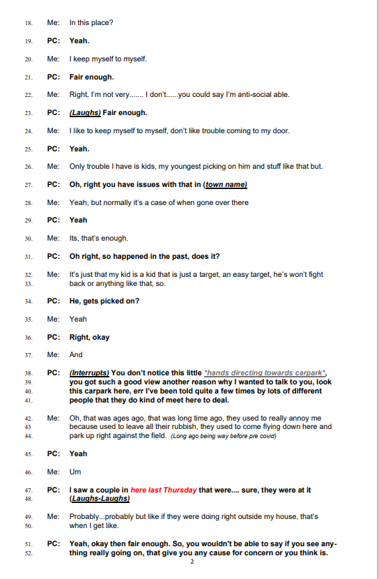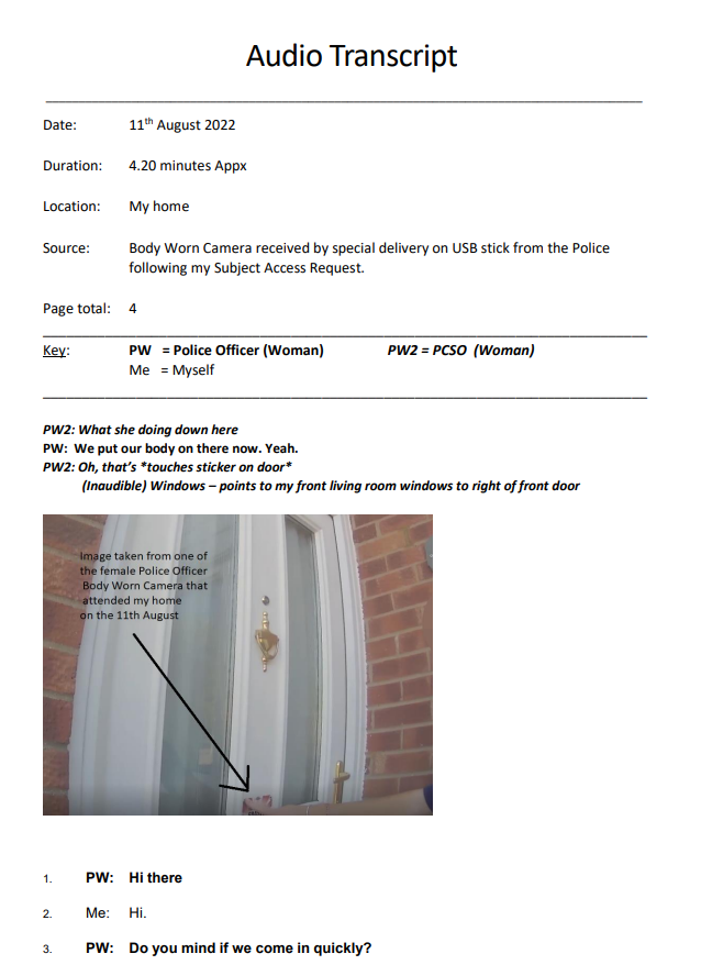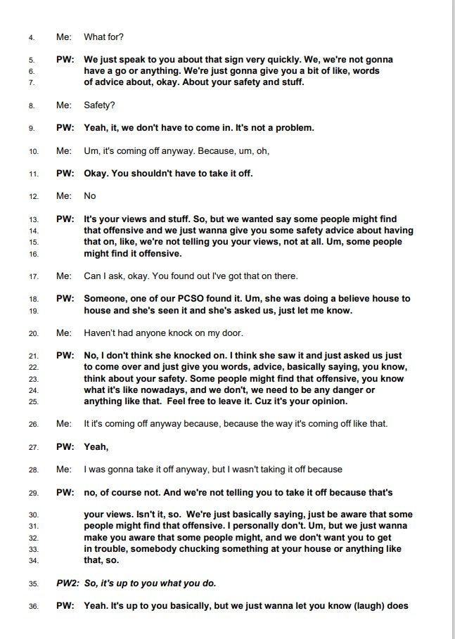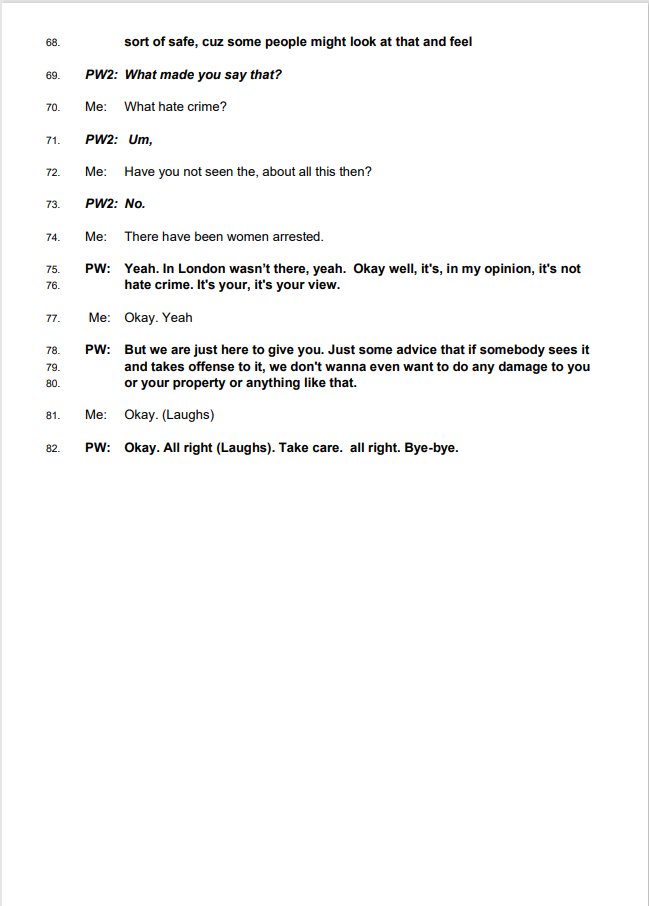 Transcript of 1st 'Official' visit from 2 members of Police Constabulary on 11th Aug (one was officer the other pcso - nice one). Pleasant exchange albeit unsure who more 'are we seriously here having this conv' me or them https://t.co/NUxLjsTaMp