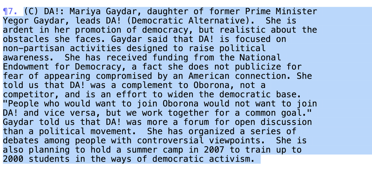 NAVALNY CIA Connection. Cable from Wikileaks about the funding by NED-CIA of the party that Navalny created in 2005 : "Democratic Alternative" (C) DA!: Mariya Gaydar, daughter of former Prime Minister Yegor Gaydar, leads DA! (Democratic Alternative). She is ardent in her promotion of democracy, but realistic about the obstacles she faces. Gaydar said that DA! is focused on non-partisan activities designed to raise political awareness. She has received funding from the National Endowment for Democracy, a fact she does not publicize for fear of appearing compromised by an American connection. She told us that DA! was a complement to Oborona, not a competitor, and is an effort to widen the democratic base. "People who would want to join Oborona would not want to join DA! and vice versa, but we work together for a common goal." Gaydar told us that DA! was more a forum for open discussion than a political movement. She has organized a series of debates among people with controversial viewpoints. She is also planning to hold a summer camp in 2007 to train up to 2000 students in the ways of democratic activism.