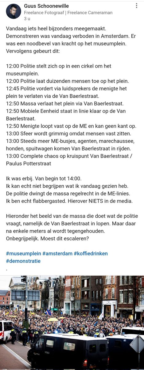 Bonus tweet. Een vergeten video, hoort eigenlijk na tweet 5. Hier zie je de ME na het noodbevel massaal het Museumplein “schoonvegen”. Je ziet duidelijk dat de menigte de van Baerlestraat al in loopt, en dat de politie en ME hier een fuik creëren. #2januariAmsterdam https://t.co/LV6G6vcZ9r