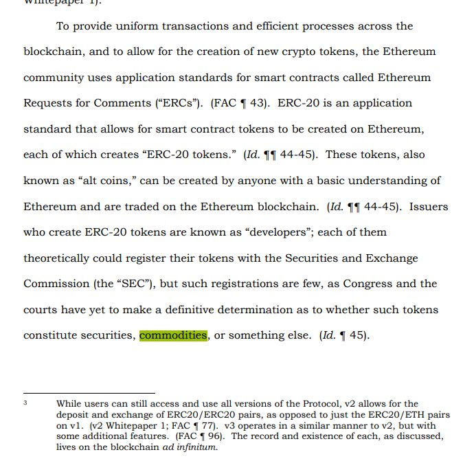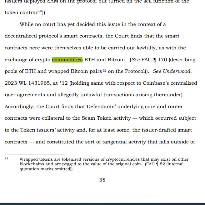There are a couple important things the Judge stated in her Order that Coinbase have got to like. First, she calls Ether a "crypto commodity." Could that just be lazy writing? Possibly, but the Judge was very aware of the difference between a security/commodity so, I doubt it. https://t.co/LT3UqIceb1