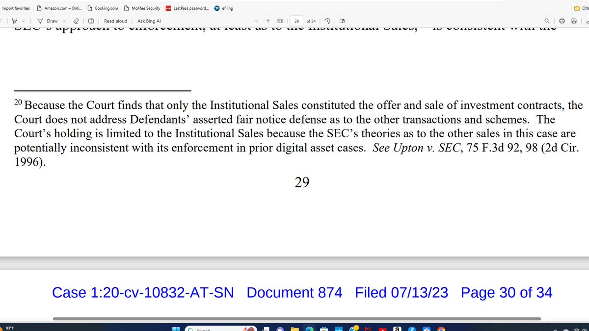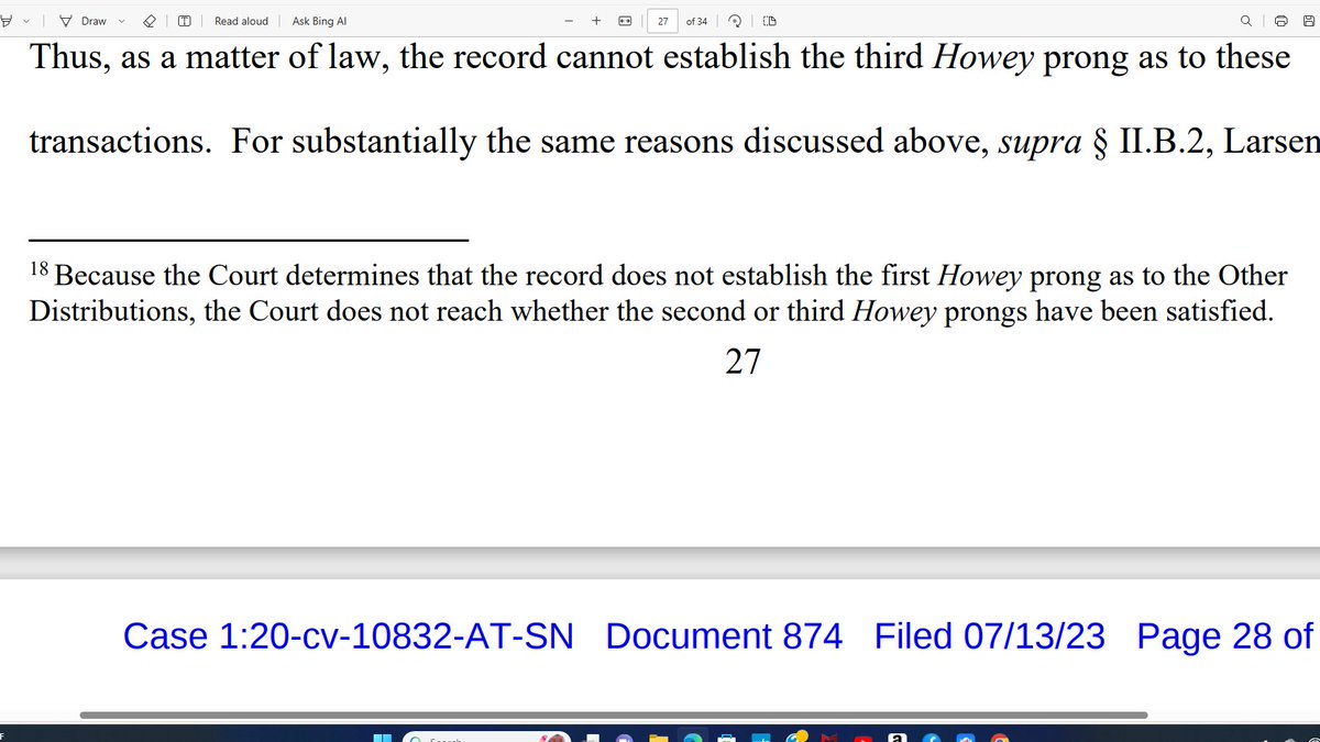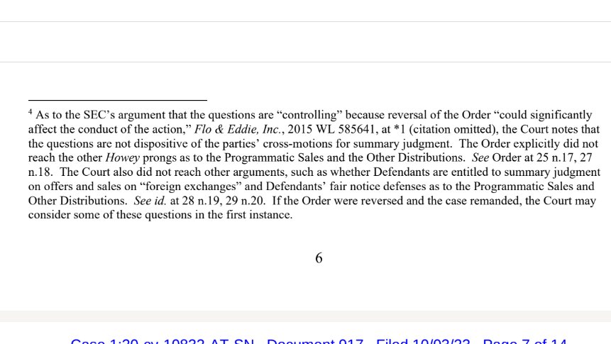 As to "other distributions" of XRP, you can see in FN 18 that the Judge did not make findings as to the 2nd & 3rd prongs of Howey. ONLY the trial judge can do that. What would the Judge rule? Who knows. ๐คทโโ๏ธ But you'd have to think there's a CHANCE she would rule for Ripple. https://t.co/ZzmOPMl5Kf