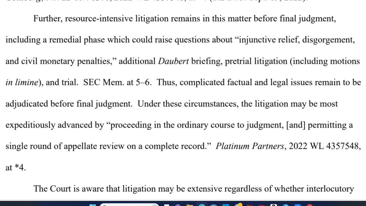 OVERVIEW: The Judge issued a "Summary Judgment" and denied an (early) appeal. The SEC has a 100% right to appeal when the whole case is finished and that will happen when there is a "Final Judgment." As you will see, the SEC has no real good options.