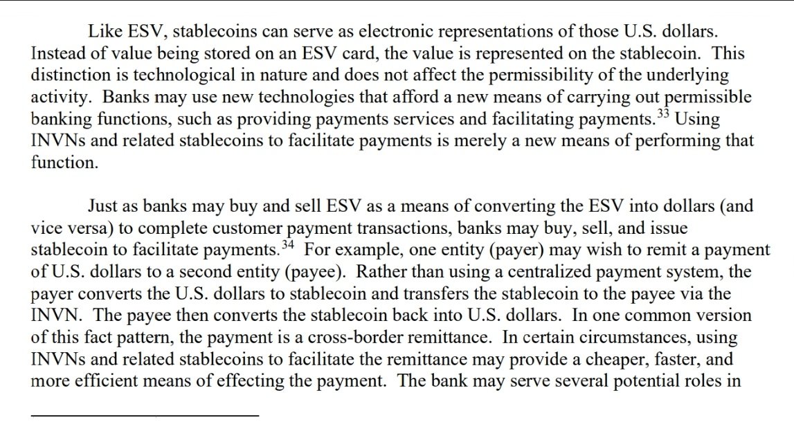 The U.S. Office of the Comptroller just released an interpretive letter Explicitly allowing banks to use distributed ledgers/stablecoins for banking activities: "We therefore conclude that a bank may validate, store, and record payments transactions by serving as a node on an INVN. Likewise, a bank may use INVNs and related stablecoins to carry out other permissible payment activities." GREEN LIGHT! https://occ.gov/topics/charters-and-licensing/interpretations-and-actions/2025/int1183.pdf