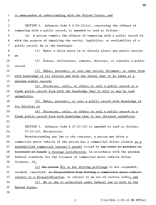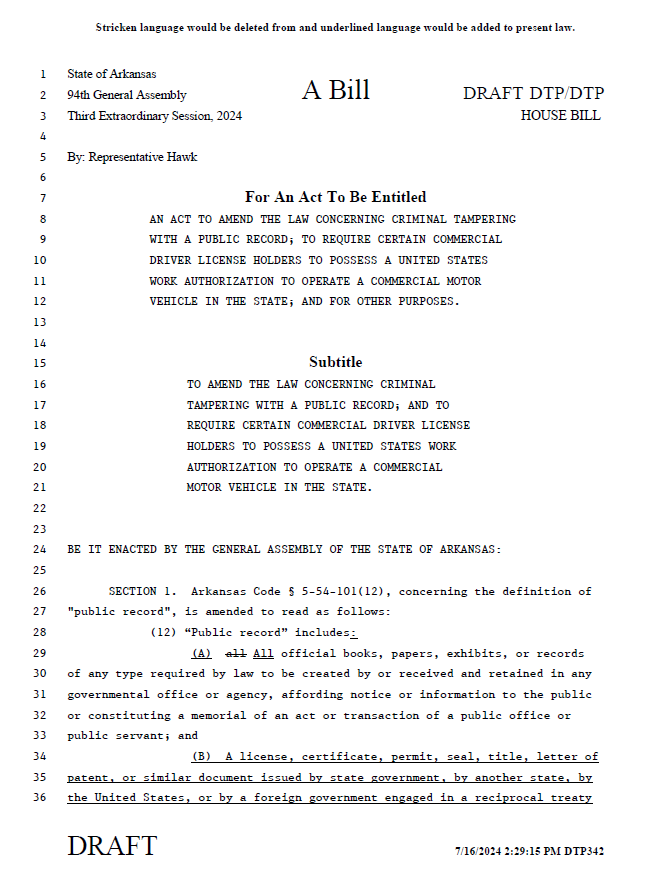 Attached is the original draft the Arkansas Trucking Association presented to Arkansas Legislators in 2024. This was an underhanded attempt to legalize Non-Domiciled Learners permits from a foreign jurisdiction on Arkansas Highways. It was this bill that started the Arkansas Battle because the Arkansas trucking association was caught misleading legislators that this would make our highways safer. The Arkansas Trucking Association was caught red handed trying to legalize Non-Domicile learners permits. INSANITY (Page 2 Section 3)