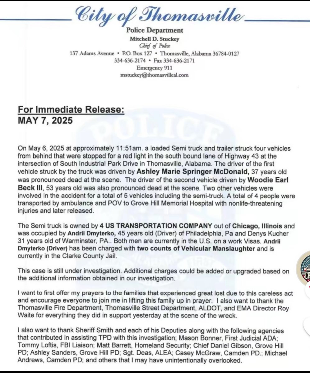 🚨Non-Citizen Eighteen Wheeler Crash in Thomasville, AL involves two truck drivers operating on Work Visas. Two people have been killed and 3 people are injured. https://www.fox10tv.com/video/2025/05/06/2-dead-3-injured-multiple-vehicle-accident-thomasville-police-say/?fbclid=IwY2xjawKIimhleHRuA2FlbQIxMABicmlkETFTUk90bm9hdWpoRWMwaTl3AR7A8ci6_NOaCUFC3b_G70hYMhLAPV_gC9w6DdFwGYah5SMAjPnWOM_9vvKhJg_aem_0jHKfYZzbdLk8XdX_wX7OA