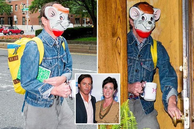 Spade is uber Deep State. Kate Spade was found dead in a Masonic ritual hanging by the neck from a doorknob in her Manhattan apartment. According to a Clinton Foundation DOCUMENT, Kate Spade was among a group that traveled to Haiti on behalf of the Clinton Foundation. She was part of the foundation’s initiative. There’s no doubt that Spade came across information regarding the Clinton foundation Haitian child sex trafficking network that got Monica Peterson killed by the Clintons. Equally as strange as Kate Spade hanging herself with a red scarf from a doorknob was the reaction of her husband shortly after the incident. Two days after Kate hanged herself from a doorknob with a red scarf Andy Spade was videotaped walking around in public wearing a mouse mask with a red scarf and newspaper hat. It was actually the mask of one of the characters from the classic Disney cartoon The Rescuers. This is some strange behavior that doesn’t fit into any box. Who the hell just happens to have an Avengers mouse mask laying around the house? NO!!! IMO, this was a public self-humiliation ritual. A nod, a message, a signaling of subservience to the Clintons or whoever had Kate killed that he understands and will be playing ball.