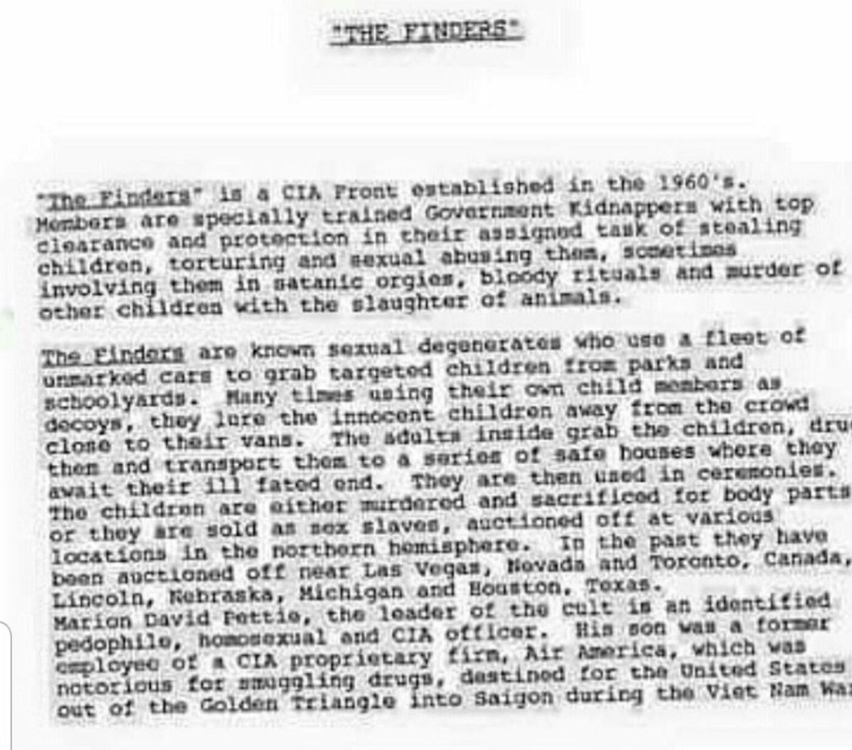 Quote from the FBI files: “Specially trained Government Kidnappers with Top Clearance and protection in their assigned task of stealing children, torturing and sexually abusing them...involving them in satanic orgies, bloody rituals, and murder of other children..” http://vault.fbi.gov The Finders