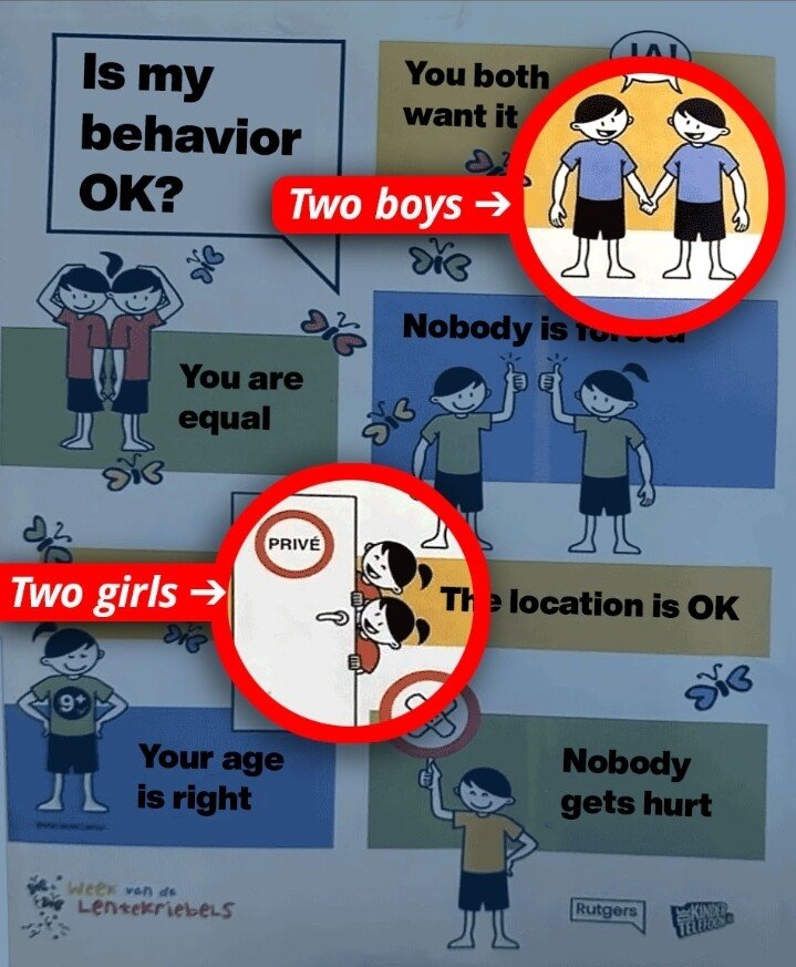 17) A school poster was put up in thousands of elementary schools. I translated it to English, and added highlights to reveal the message of this school poster. Two boys hold hands and say, “Yes, we want it”. Two young girls find a “safe place” to have sex.