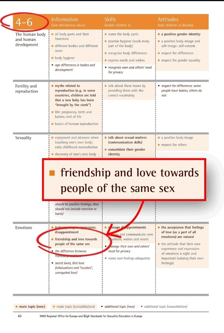 20) On page 40 of the “Standards for Sexuality Education” schools are told to teach four year olds about “same-sex relationships“ and on page 44 educators are instructed to teach nine year olds about “friendship and love towards people of the same sex”.