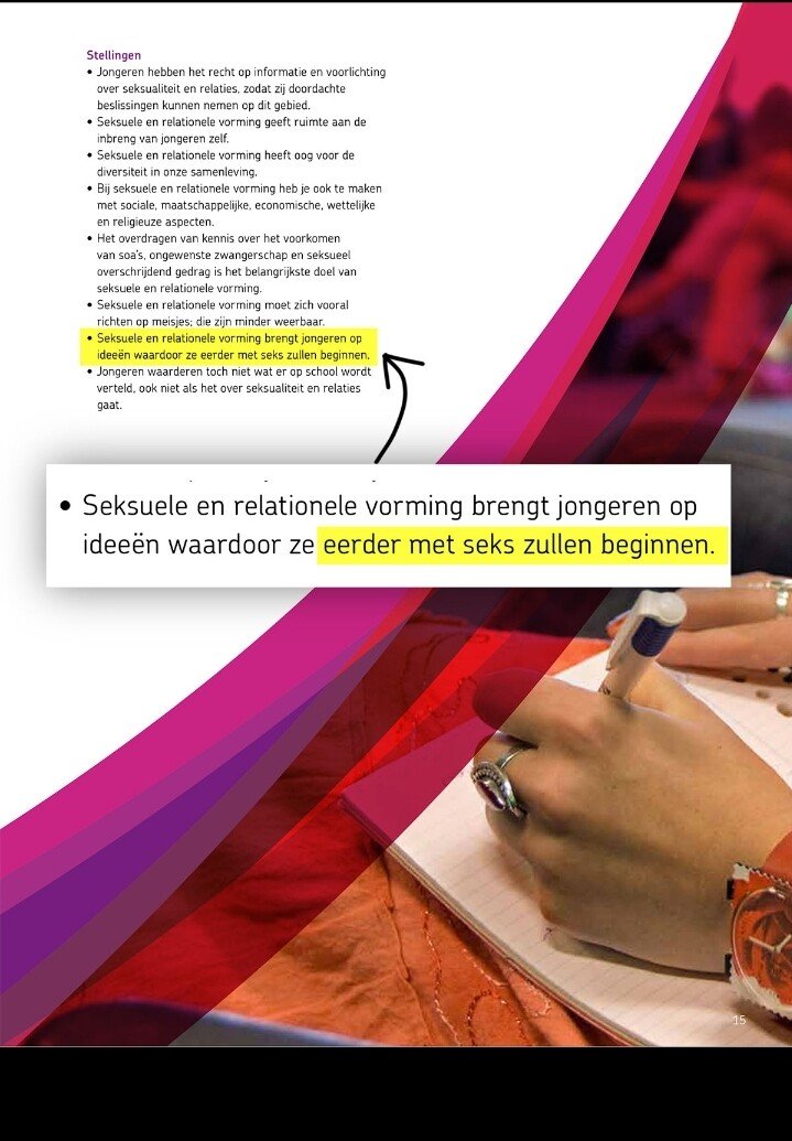 31) A staff member of Rutgers contributed to the WHO guide. In this document Rutgers makes a clear statement what the purpose is of this type of education (see document below): "Sexual & relationship education gives children ideas that will help them to start with sex sooner."