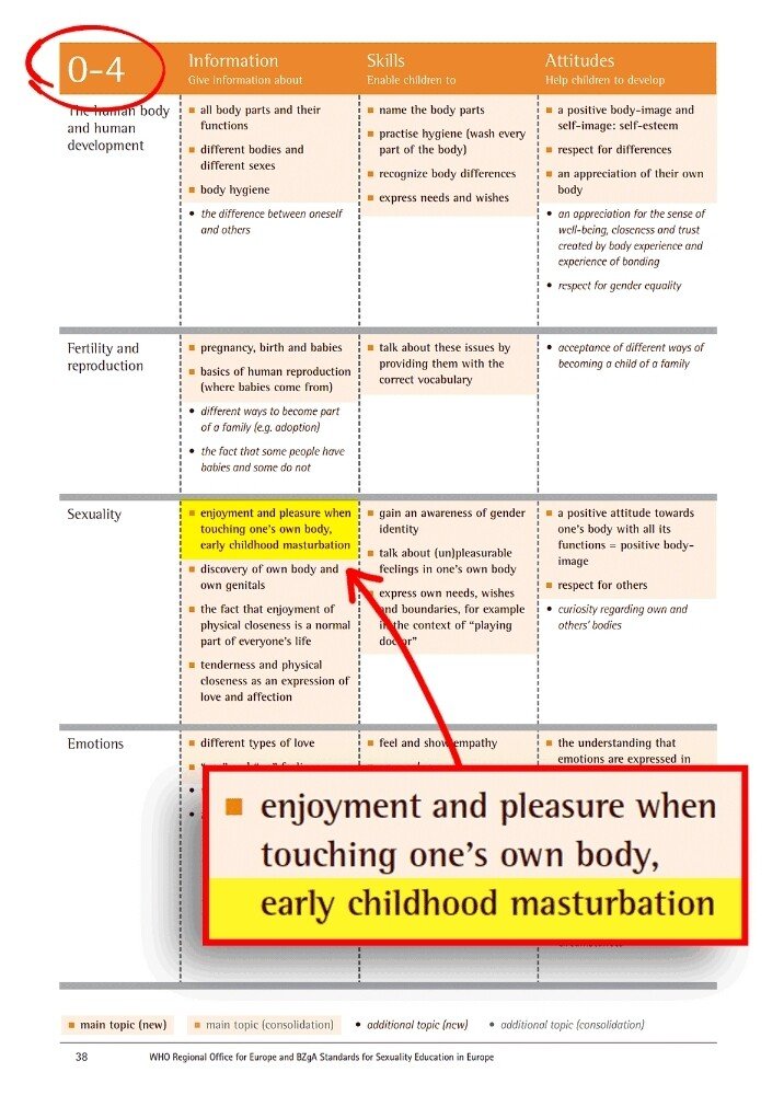 29) ✓ Toddlers in the age group of 0-4 must learn about falling in love, intimacy and sexual feelings. ✓ Little kids from the age of 5 should learn about sexual intercourse, online pornography and experiencing lust through touching their own body.