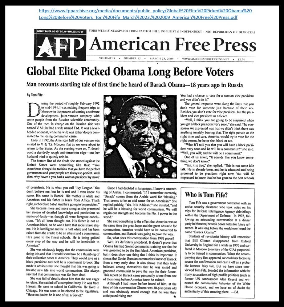 In 1992, while at a business dinner in Moscow, Russia, Government contractor Tom Fife said that he was told that a young man named Barack Obama was receiving Soviet Communist training and was being groomed to be America's first black president with a hidden communist agenda. Here is the direct link: https://fpparchive.org/media/documents/public_policy/Global%20Elite%20Picked%20Obama%20Long%20Before%20Voters_Tom%20Fife_March%2023,%202009_American%20Free%20Press.pdf…