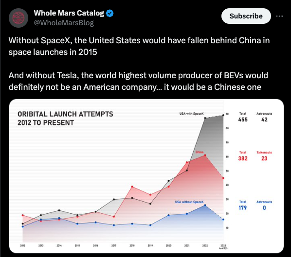 Meanwhile, the engineers who started with nothing but their proverbial garage have delivered things that are internationally competitive, and on the ascent. Yeah, it’s your email, your smartphone, and your internet services — but also your artificial intelligence, your electric cars, and your reusable rockets. Without Elon, NASA is far behind China[1]. Without tech, the flailing S&P 500 is the drowning S&P 493[2]. Without the Internet, there is no alternative to the false news printed by the New York Times and the false narratives promulgated by Harvard. This is why establishment hacks hate the Internet — because it's a source of parallel elites, and parallel institutions. And they don't want the competition. [1]: [2]: https://www.cnbc.com/2023/10/06/magnificent-seven-returned-92-percent-this-year-but-its-risky-for-markets.html