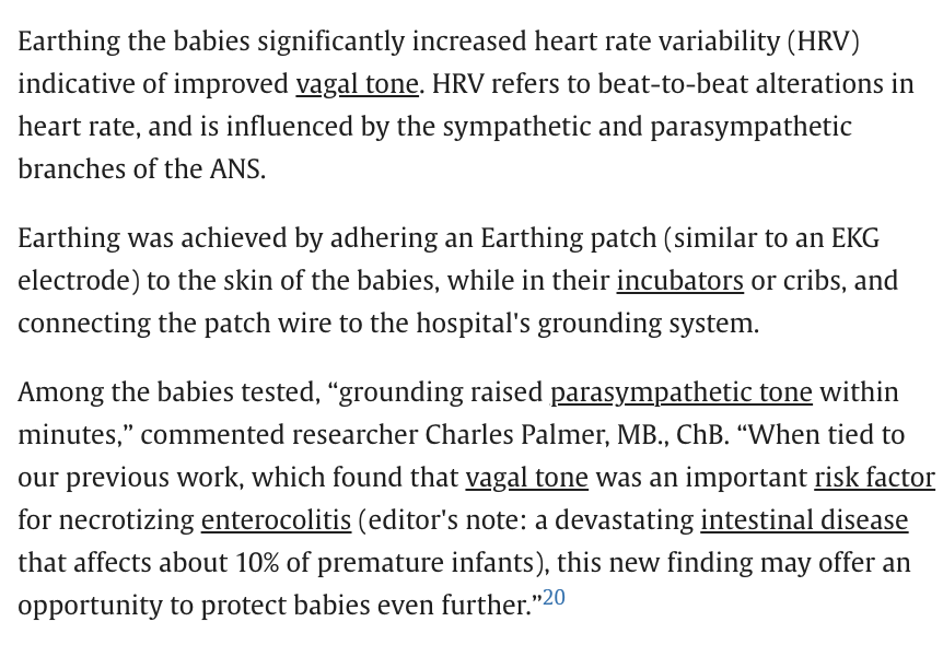 Researchers at Pennsylvania State University Children's Hospital found that grounding premature infants significantly improved their autonomic nervous system function. The babies showed better vagal tone within minutes.