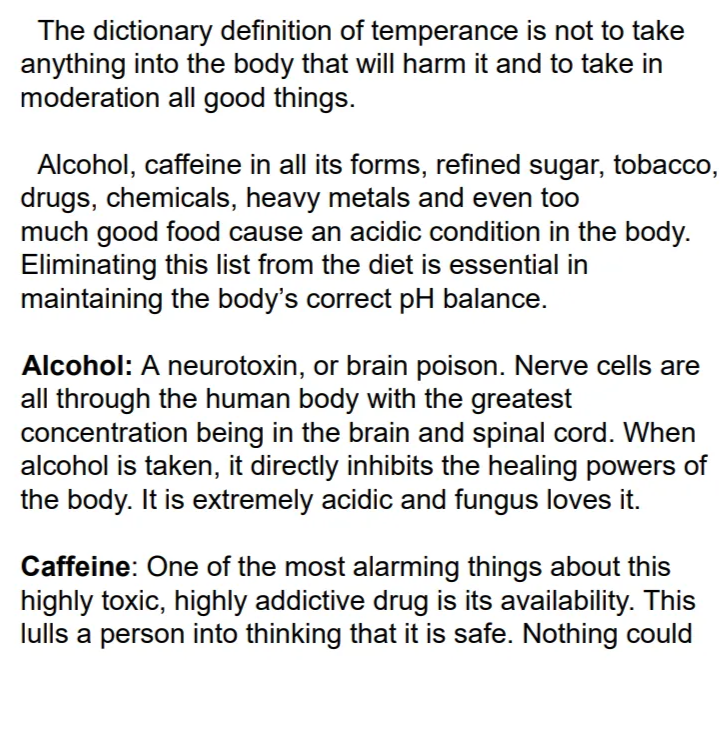 2) Abstain The dictionary definition of temperance is not to take anything into the body that will harm it and to take in moderation all good things. Eliminating this list from the diet is essential in maintaining the body’s correct pH balance.