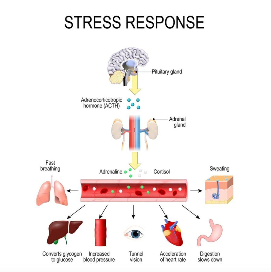 Due to our large brains—we can think about problems—therefore turning on the cascade of stress chemicals by THOUGHT alone. We can knock our brain and body out of normal physiology just by thinking about past or trying to control an unpredictable future.