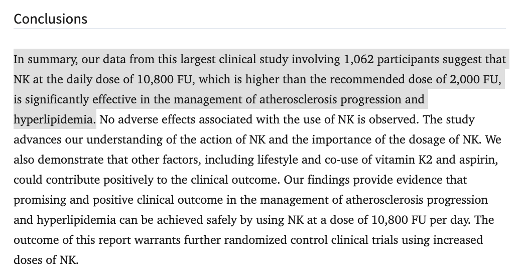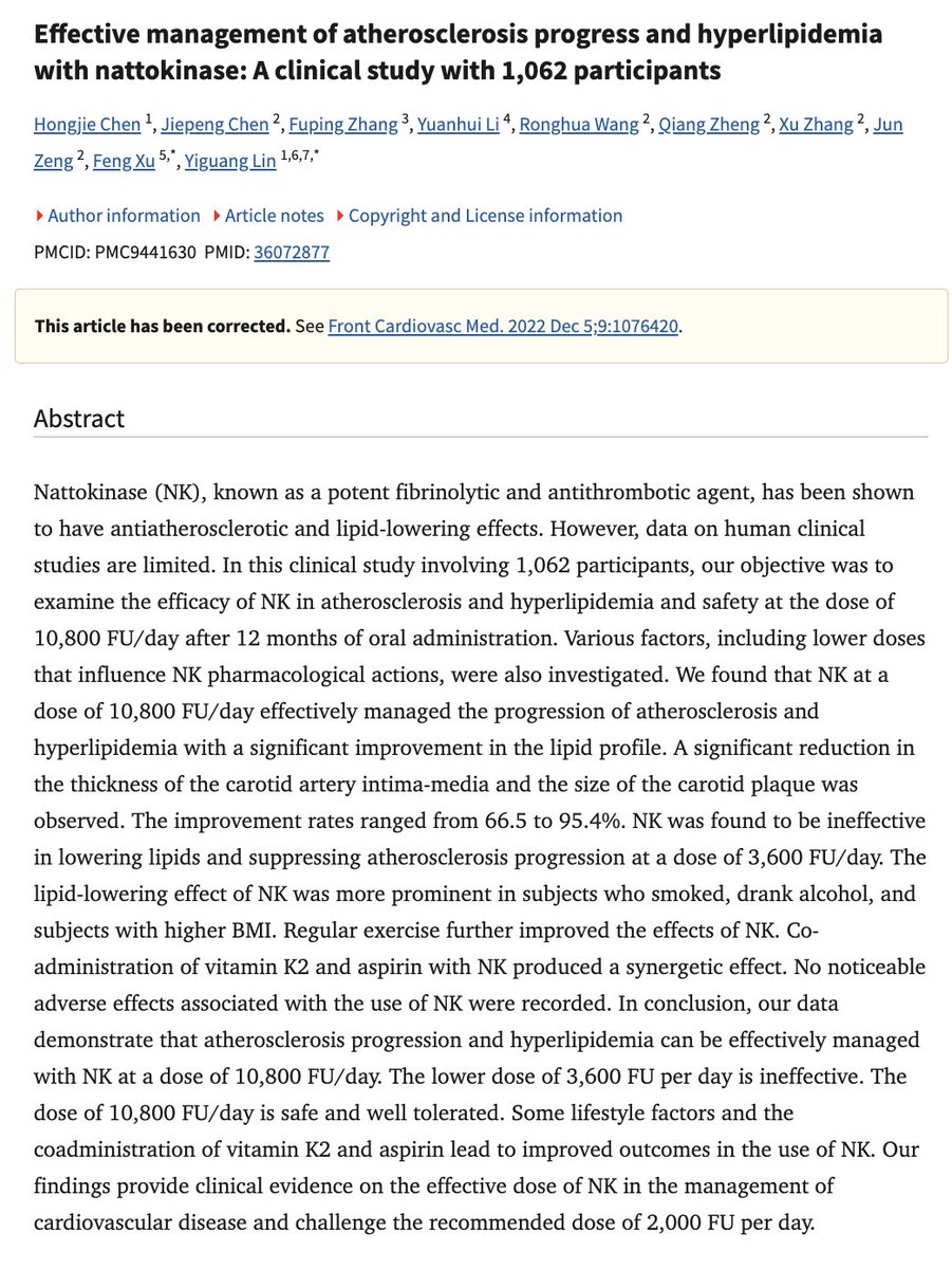 This study, involving 1,062 participants, suggests that a daily dose of 10,800 FU of NK reverses heart disease without adverse effects. It's truly a powerful supplement. https://t.co/xdPijJlZ0Q