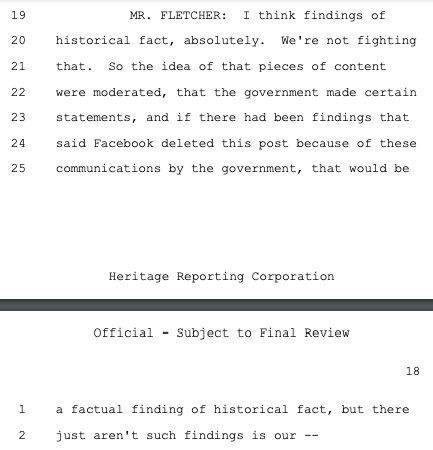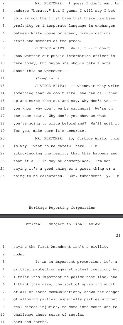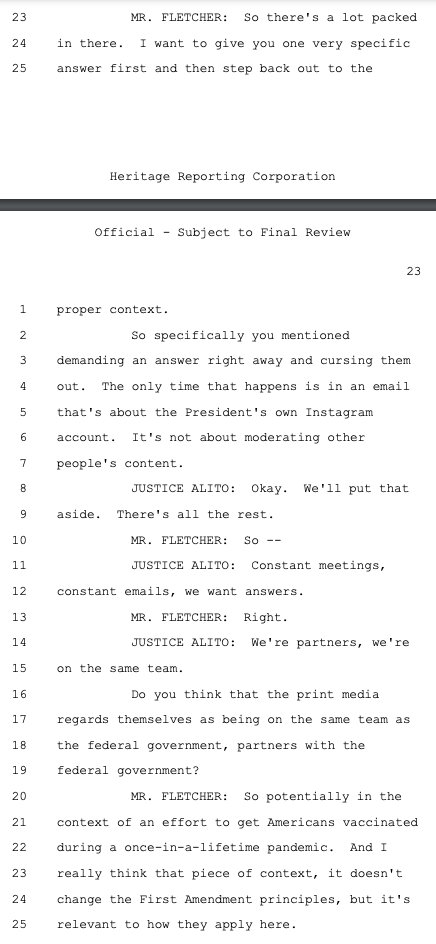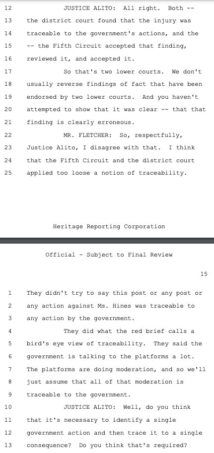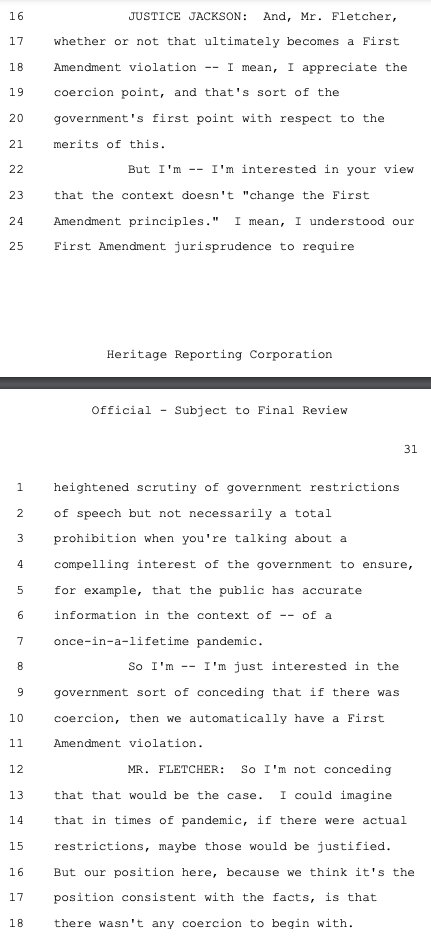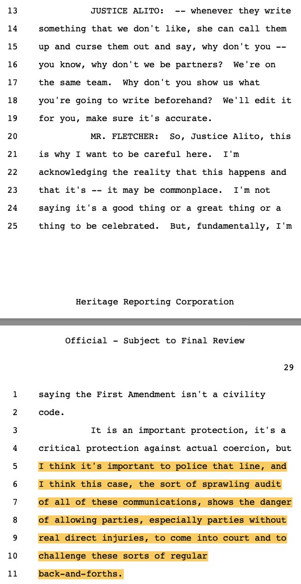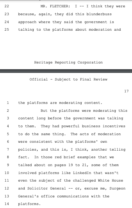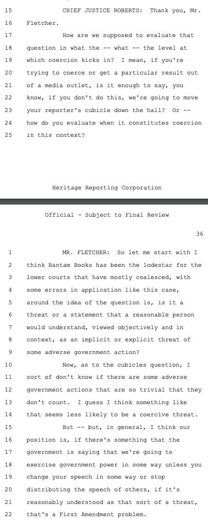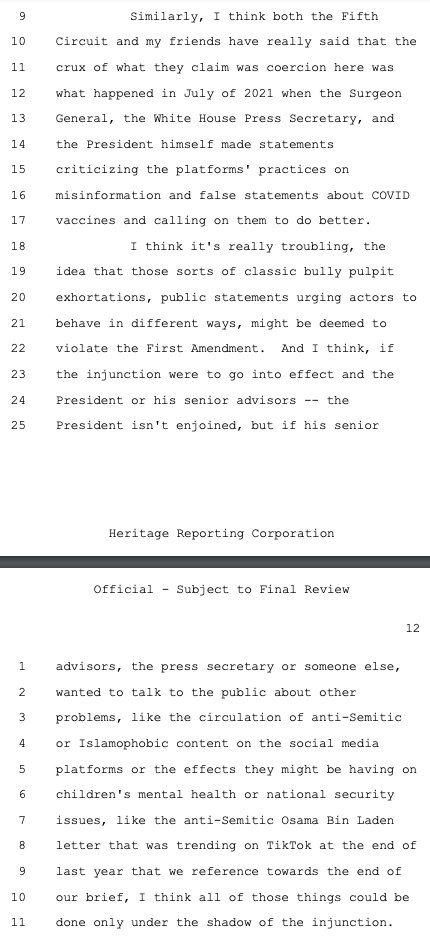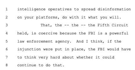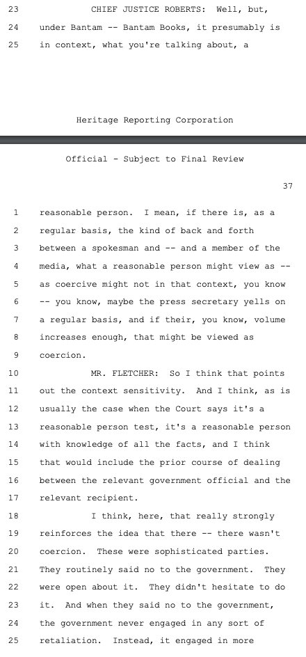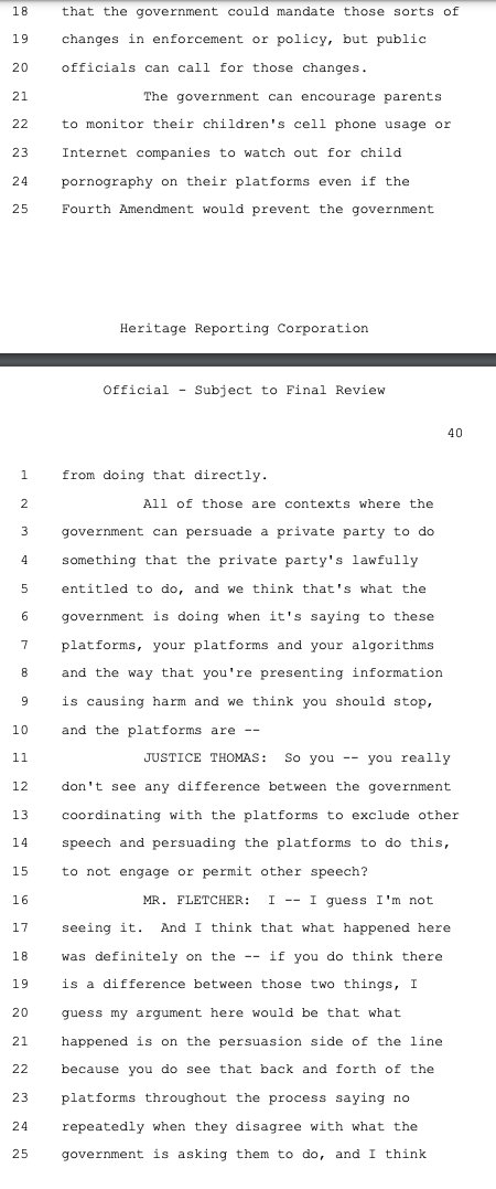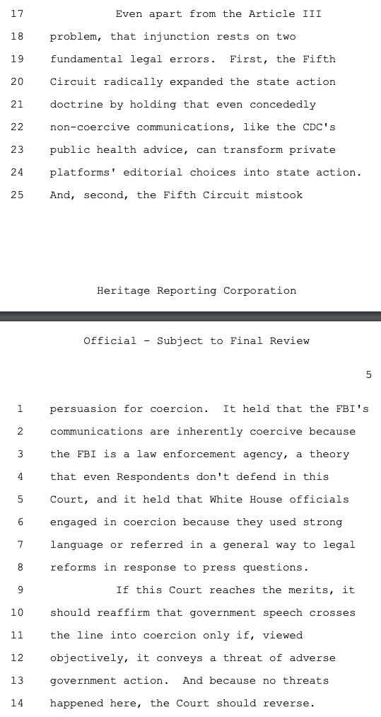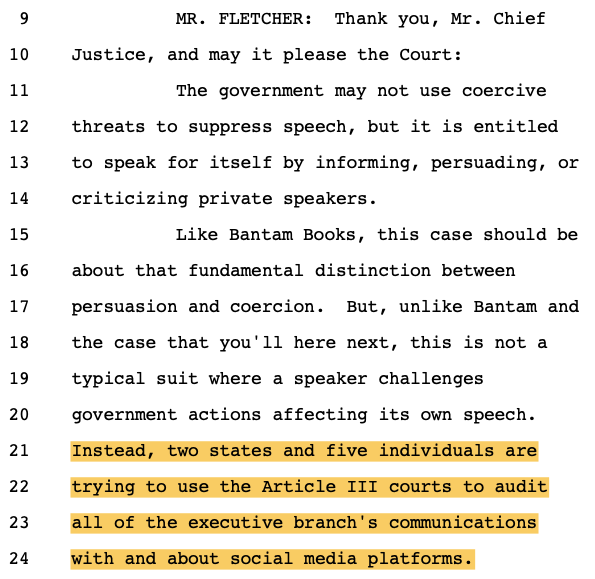 Principal Deputy Solicitor General Brian Fletcher sought to make this case about the government using mere "persuasion" (legal) versus "coercion" (illegal) to pressure social media companies to violate the First Amendment on its behalf as deputized speech police. While there was a raft of evidence of coercion, Philip Hamburger -- whose @NCLAlegal represents some of the plaintiffs in Murthy -- persuasively makes the case that that isn't the right standard. As the plaintiffs wrote in their brief, citing Hamburger: "The First Amendment does not require a strict showing of explicit coercion, but capaciously protects the freedom of speech from any 'abridging' (i.e., diminishing) of that freedom."