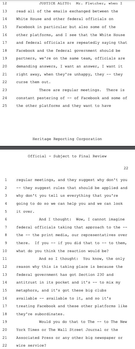 Justice Alito points to the government-as-mafia subtext underlying this case -- that when it constantly browbeats and demands that a private company do X, Y, Z, it does so with immense power. What's more, it does so here with platforms who use a Section 230 shield while at the same time acting as publishers, not neutral conduits for communication