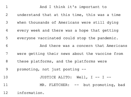 Justice Alito pressed the government on defending its berating of the social media platforms over their need to engage in greater COVID censorship in one humorous exchange https://t.co/9N2mDkhN1Q