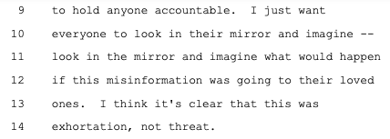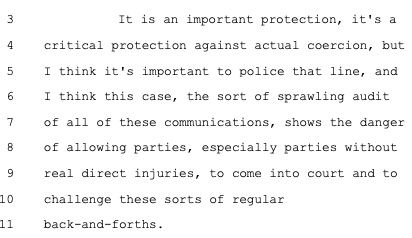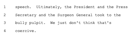 The government also "think[s] it's really troubling, the idea that...classic bully pulpit exhortations, public statements urging actors to behave in different ways, might be deemed to violate the First Amendment." But those public comments were only a fraction of the plaintiffs' case, which showed that privately -- and with the threat of adverse consequences -- the feds repeatedly browbeat and badgered platforms to censor Wrongthinkers