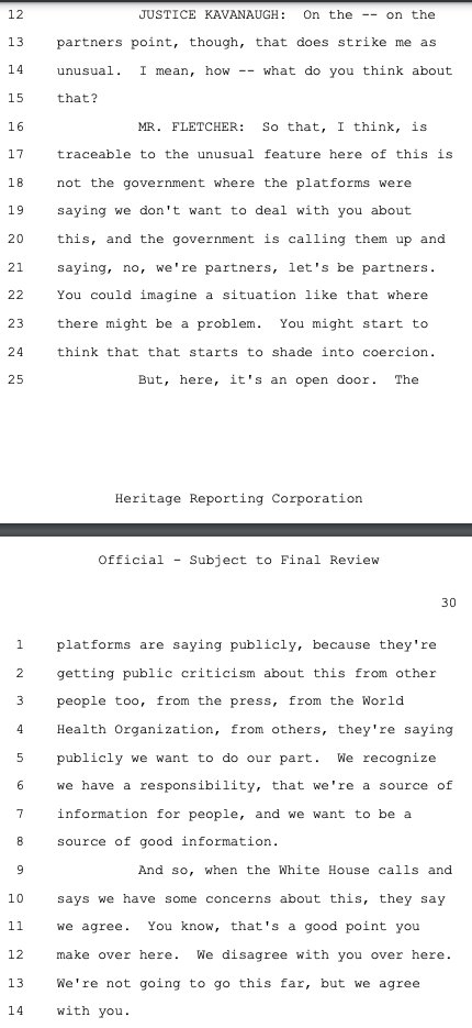 In a rare instance of skepticism, Justice Kavanaugh briefly presses the government on its "partnering" with the social media platforms in content moderation. The government characterizes the relationship as an "open door." But is it an "open door" when you're being hectored publicly about the danger of "mis-, dis-, and mal-information" proliferating on your platforms, and officials all across the government are engaging in a "sprawling audit" of your efforts, constantly pestering and browbeating you to censor more, and doing it all with the potential power to break you via regulation and law?