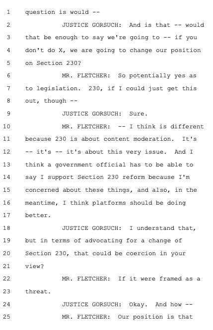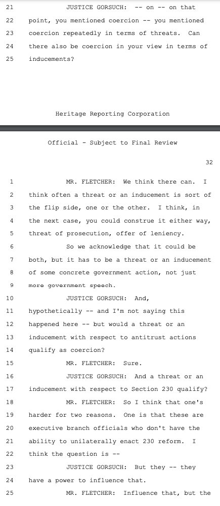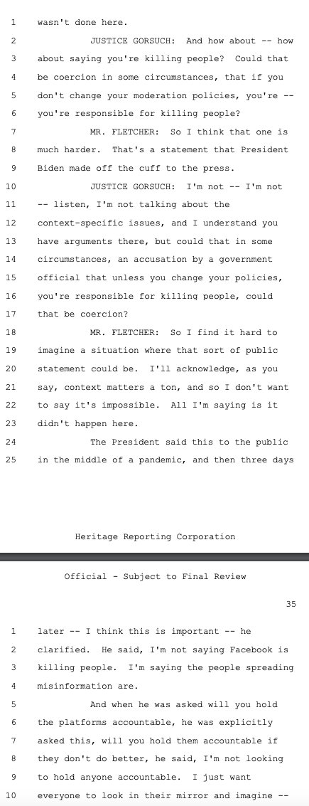 Justice Gorsuch gets the government to concede that not just threats but inducements could each be coercive -- including regarding Section 230. He also presses the government on President Biden using the bully pulpit to claim platforms were "killing people" by allowing people to engage in Wrongthink regarding COVID