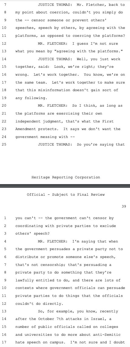 Justice Thomas presses the government on the idea that the government and social media platforms could've colluded to censor speech, rather than that there was coercion. The back-and-forth also seems to approach antitrust territory, about government-induced collusion between the platforms to censor speech