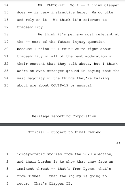 The government also says "we certainly don't think that they [the plaintiffs] have shown that they face the sort of imminent threat of future injury that's required to satisfy Article III." Translation: It wants the Censorship Industrial Complex to be fully operative in 2024