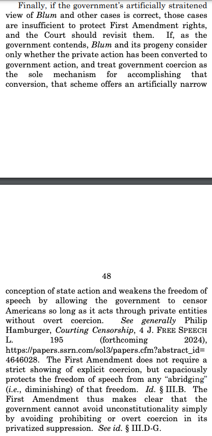 Another key plank of the government's case is that the freeze on fed-led speech policing imposed by the Louisiana District Court and the 5th Circuit Court of Appeals "radically expanded the state action doctrine by holding that even concededly non-coercive communications, like the CDC's public health advice [I would put that in air quotes], can transform private platforms' editorial choices into state action." Thing is, if we do not "radically expand[] the state action doctrine" -- idea being that when a state pressures, coordinates, and colludes with private entities, it transforms them into state entities restricted by the First Amendment, etc. -- then we're going to see the state weaponize virtually every institution against Wrongthinkers to do its bidding. If you want to avoid a social credit system, I'm not sure how you don't expand state action doctrine. That's one reason this case transcends the First Amendment.