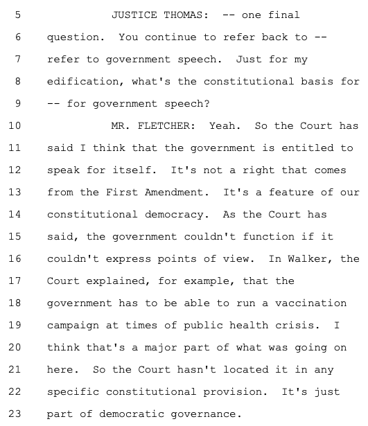 Justice Thomas early in questioning calls out the government over its belief in an expansive government right to speech (but, left unsaid, apparently a far more narrow right for Americans). USG: "It's not a right that comes from the First Amendment. It's a feature of our constitutional democracy." Is it a "feature of our constitutional democracy" though to use government speech (backed with the awesome powers of the federal government) to deputize speech police and abridge our rights?