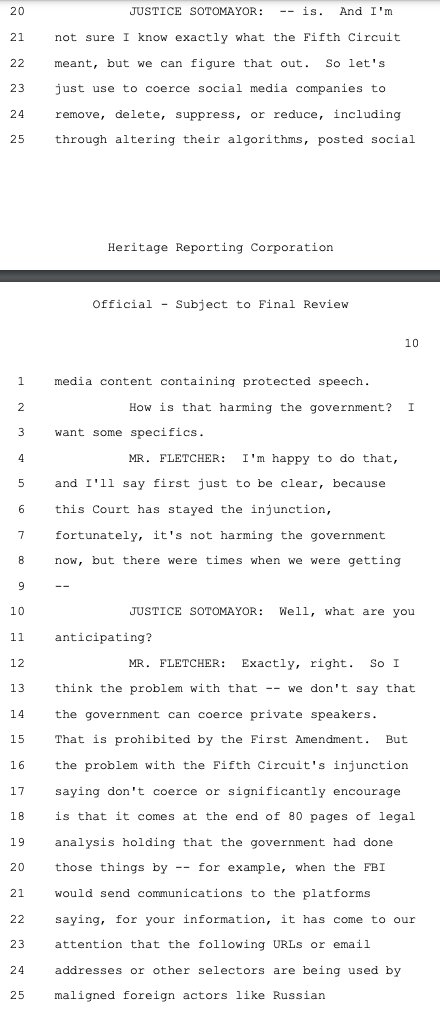 Justice Sotomayor presses Fletcher to explain how the preliminary injunction in question freezing federal speech policing by proxy harms the government. Fletcher, framing this case as if the government is largely concerned with combatting foreign threats through consorting with social media platforms regarding content moderation -- when in reality it used the foreign pretext to target Americans on a whole bevy of political and public policy issues -- says "if the injunction were put in place, the FBI would have to think very hard about" its communications with platforms. That's the whole point though, isn't it? The government should have to think long and hard when it is considering taking action that could violate our rights.