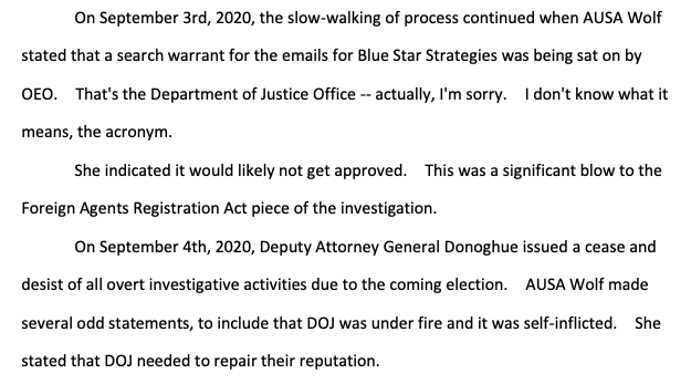 Shapley in May 2021 memo: "Through interviews and review of evidence obtained, it appears there may be campaign finance criminal violations. AUSA Wolf stated on the last prosecution team meeting that she did not want any of the agents to look into the allegation. She cited a need…