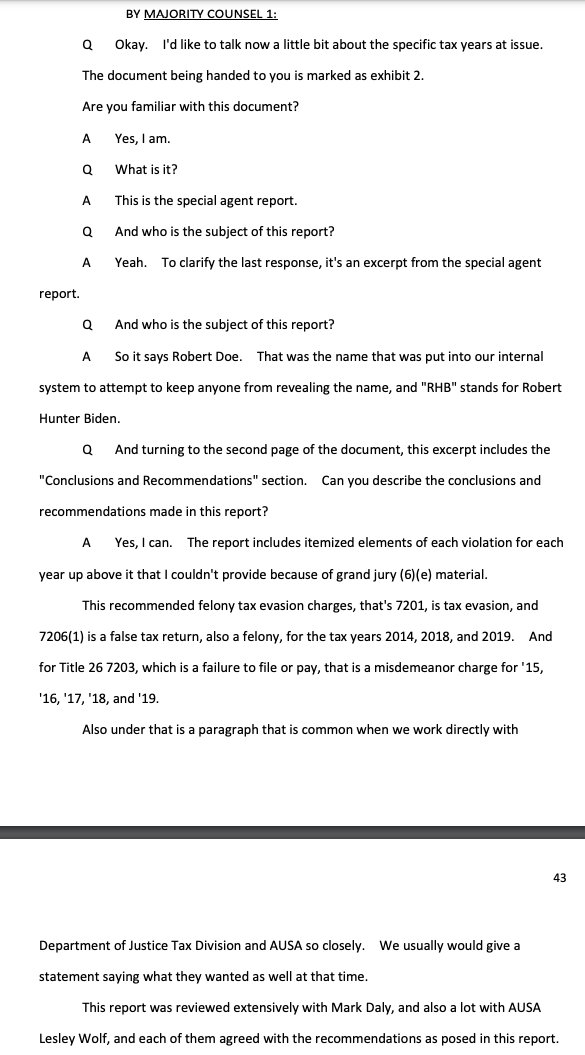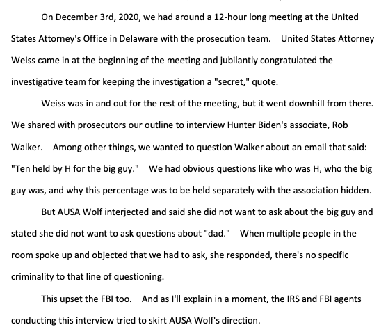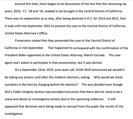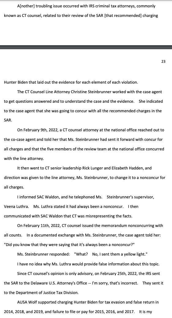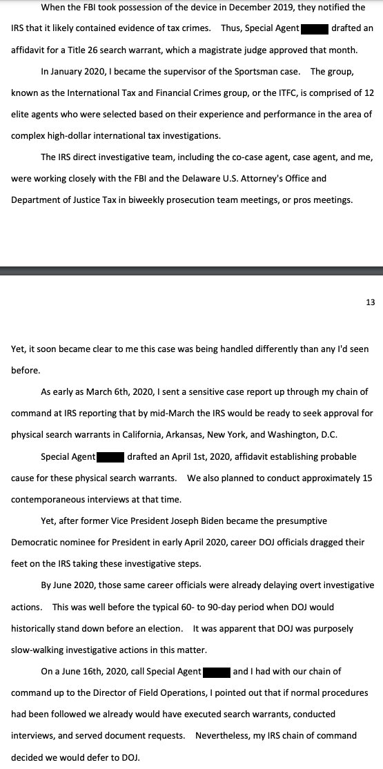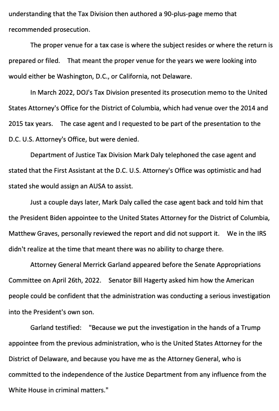 "the criminal tax investigation of Hunter Biden, led by the United States Attorney's Office for the District of Delaware, has been handled differently than any investigation I've ever been a part of for the past 14 years of my IRS service" https://waysandmeans.house.gov/wp-content/uploads/2023/06/Whistleblower-1-Transcript_Redacted.pdf#page=12