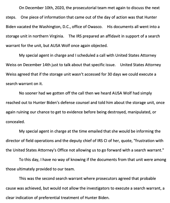 "If search warrants or witness interviews or document requests that include the actual subjects' names are not allowed, for example, that is simply a deviation from the normal process that provided preferential treatment, in this case to Hunter Biden." https://waysandmeans.house.gov/wp-content/uploads/2023/06/Whistleblower-1-Transcript_Redacted.pdf#page=11