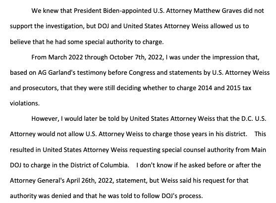 But the venue for the case would be D.C. or California, not Delaware. AUSA for D.C., relevant authority for '14 and '15 was Matthew Graves, a Joe Biden appointee. He "personally reviewed the report and did not support it." Biden appointee killed Hunter Biden charges